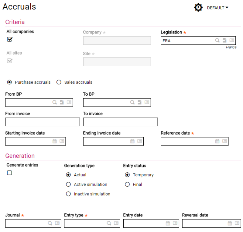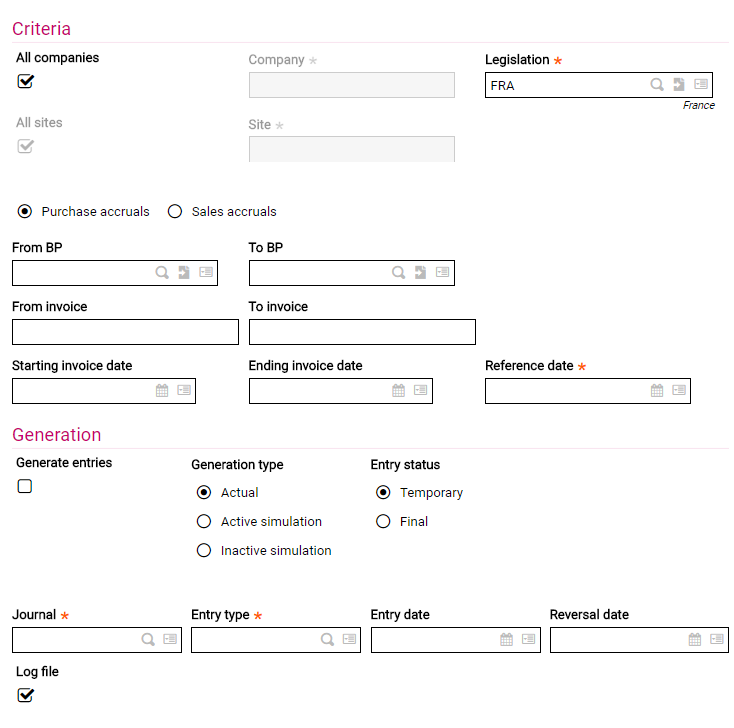 These fields define whether the process is for Purchase Accruals or Sales Accruals.