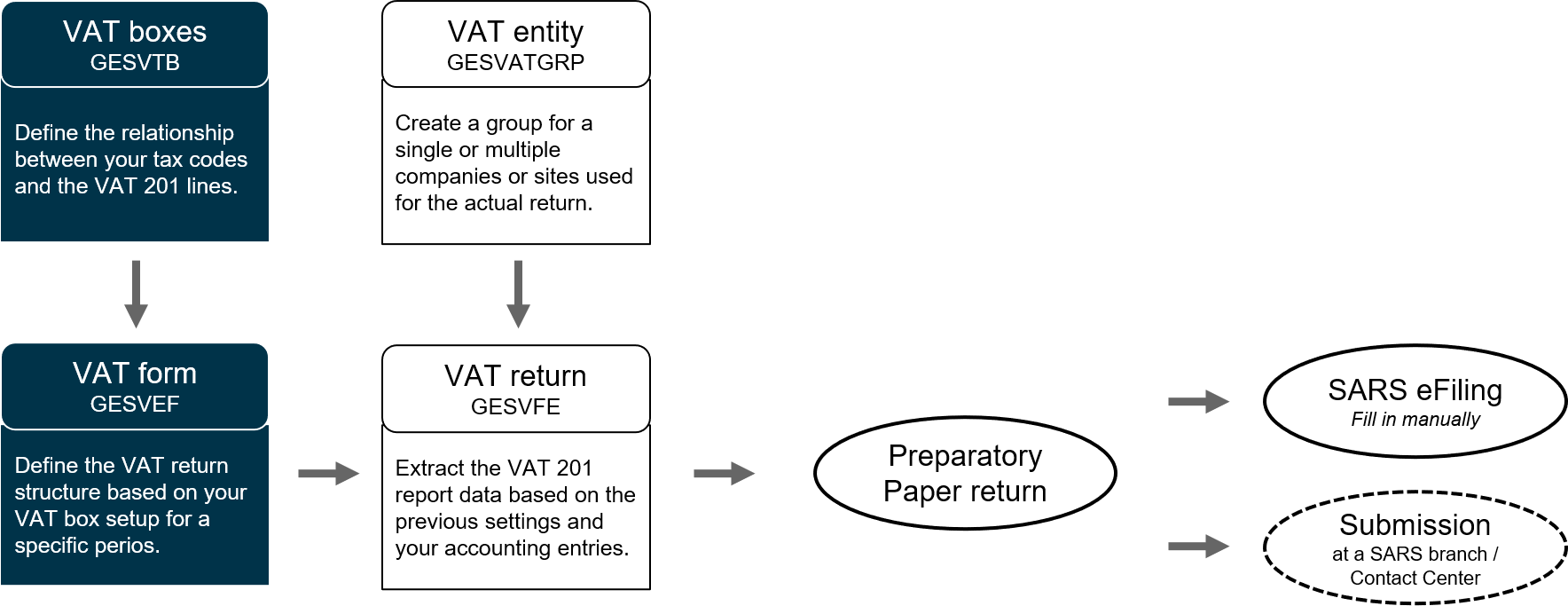 The VAT framework includes dedicated functions designed to facilitate calculating and validating VAT returns but does not include direct submission from Sage X3. For specific legislations, including the South African, there is a preset structure for VAT boxes and tax file generation that conforms to the respective tax laws. There is also a generic VAT declaration that can be customized for legislations not part of the framework.
