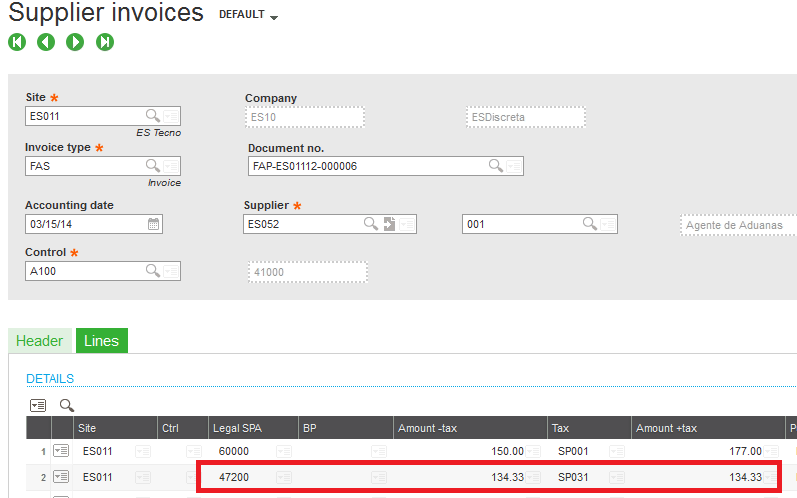 - The Custom agent invoice:This invoice inlcudes the normal domestic invoice and the VAT amount for the previous import purchase invoice. The invoice is entered as a supplier BP invoice to capture this line into a VAT type account.