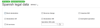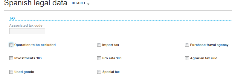 - In the Tax rates function (GESTVT), in the Spanish legal data screen, complete the Associated tax code field and select the checkboxes to define the type or types of transactions.