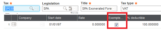 - For the first tax rate, select the checkbox in the Exempted sale column. This tax rate is not included in the VAT calculated for the import invoice.