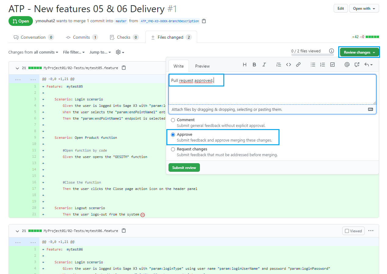 Now that your feature branch is up to date with master, you can create a pull request process to merge your automation test feature branch into master.