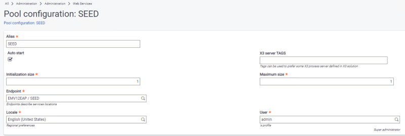 The following fields should match the information you entered when you configured your web service pool in Sage X3: