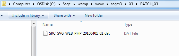 The name of the file is SRC_SVG_WEB_PHP_YYYYMMDD_NN.dat. It is located in the following directory: C:\Sage\wamp\www\X3\PATCH_X3.