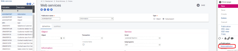 In Sage X3, navigate to Development > Script dictionary > Scripts and open Web services (GESAWE).