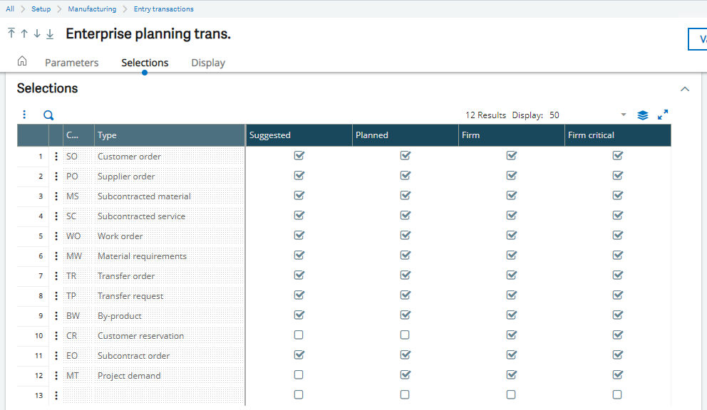 La lista de eventos previstos incluye solicitudes de Gestión de proyectos con el tipo de orden Solicitud proyecto y en estado Planificada (MTP) o Firme (MTF). Las sugerencias individuales de órdenes de fabricación y de pedidos de compra se generan, según corresponda, para cada componente vinculado a los proyectos incluidos en los criterios de selección.
