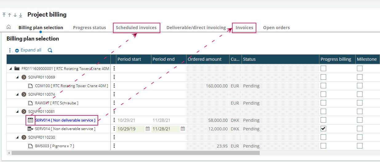 En el sector industrial, suele ser necesario separar los flujos de material, incluidas las entregas de artículos, de los flujos de facturación cuando el proyecto es de larga duración. En estos casos, se pueden utilizar las facturas programadas, la facturación por hitos o la facturación de progreso. El sector servicios no suele depender de artículos de material.