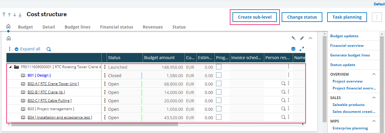 3. Los niveles inferiores se consideran tareas de gastos, es decir, tareas de mano de obra, tareas de material o tareas mixtas (mano de obra/material).