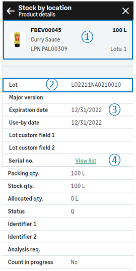 • el número de contenedor de interno (si el artículo está gestionado por número de contenedor interno) o la ubicación (si el artículo no está gestionado por número de contenedor interno)