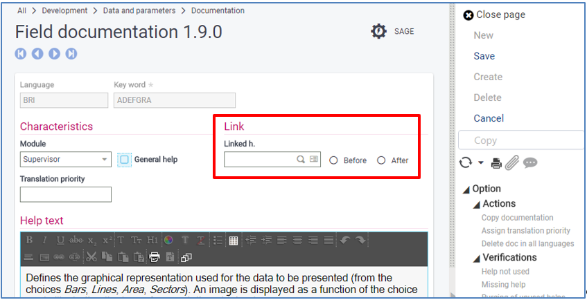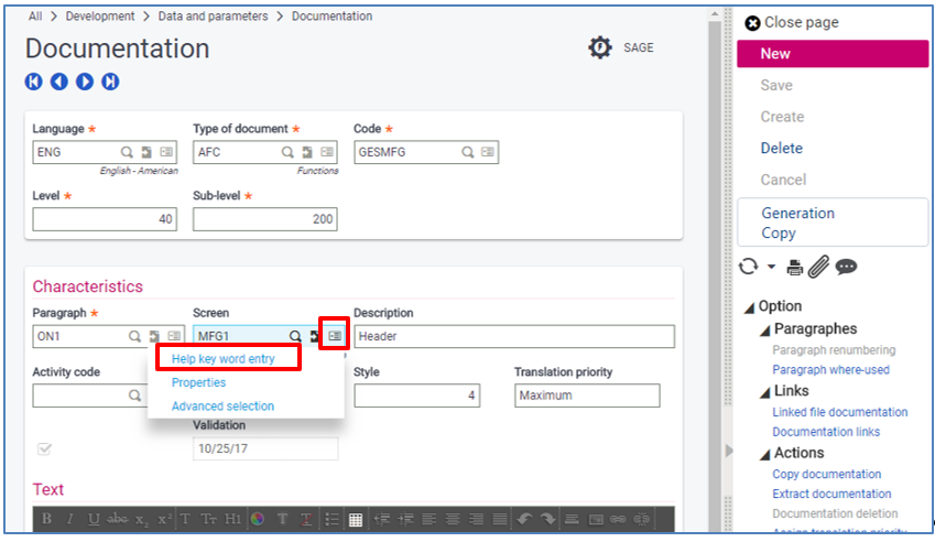 In the Help key-word field of one key-word (field), click the Actions icon then click Jump to. You are redirected to the Field documentation function (GESADZ).