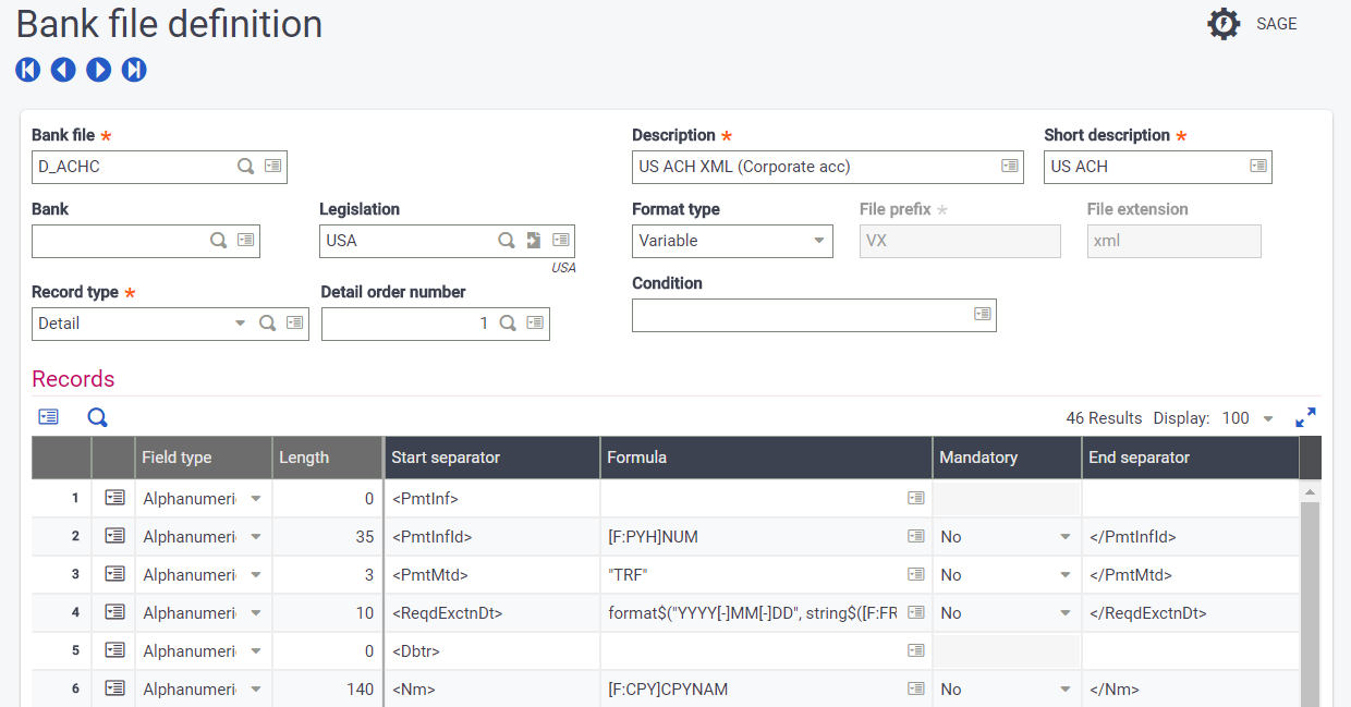 Next, create the bank file definitions that define how the data is transmitted. These definitions are based on your bank’s requirements. ACH formats are very standardized and could be the same for different banks or have only slight differences.