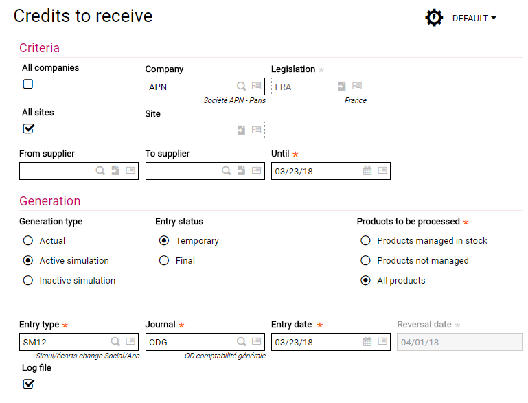 You can generate a credit to receive by return, or a credit to receive by combination of: Company, Site, Supplier and Currency, according to the option Grouping selected in the PTH automatic journal entry header:
