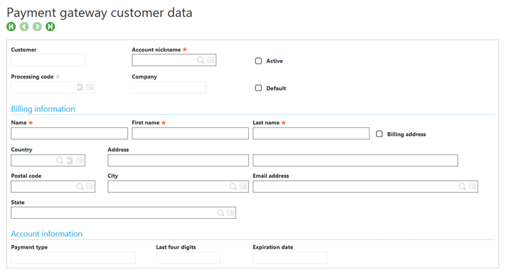 On the Payment gateway customer data page, enter a unique name in the Account nickname field to identify the credit card and select a Processing code.