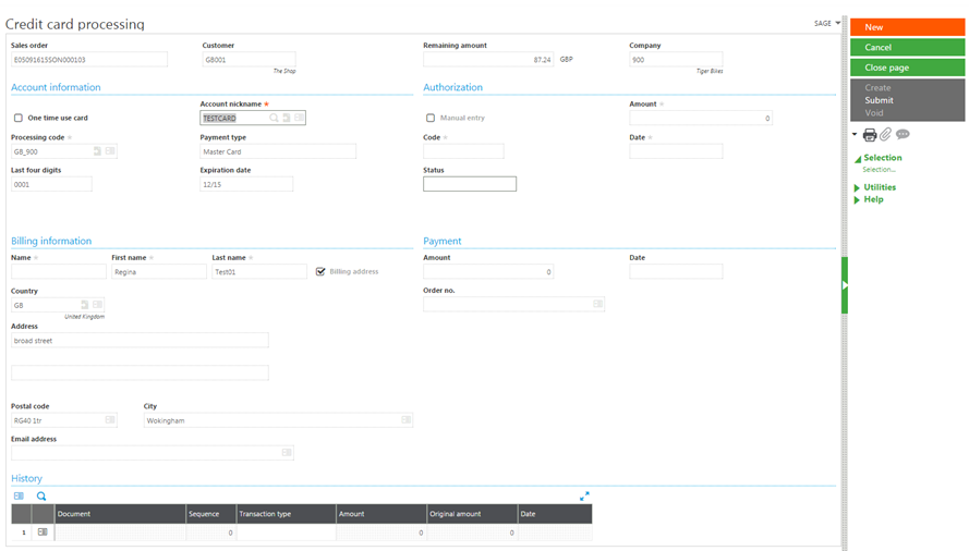 Click Submit on the Credit card processing page to authorize a payment amount in Orders, Invoices, Payment/Receipt entry, and Customer BP invoices.