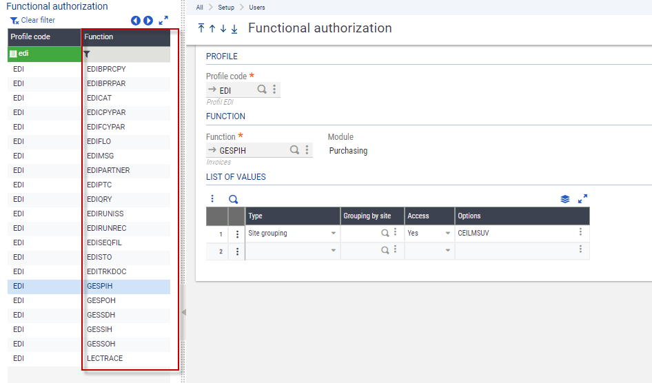 Authorization to use the EDI management functions as well as those linked to purchase and sales documents.