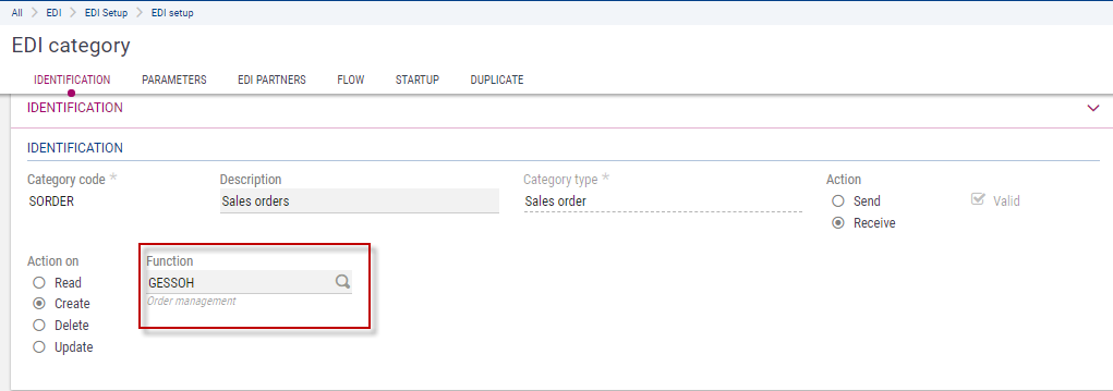 You can limit the EDI inbound and outbound message generation to some document categories according to the user's function profile. For each relevant category, specify the function code corresponding to the category. Then, the user's functional authorizations defined for this function will be used to limit the generation of EDI outbound messages to some sites or site groups, for example.