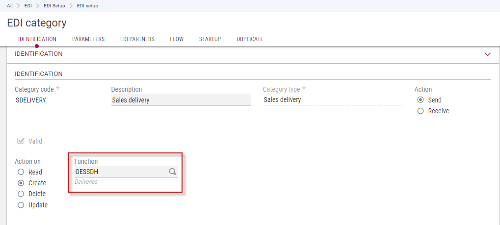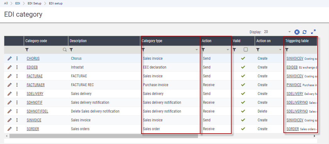 • The action that needs to be performed: sending or receiving the document. Depending on the action to be performed, the category configuration can vary,