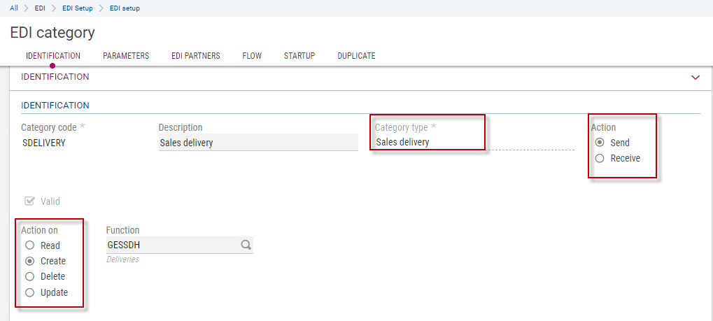 Category creation is controlled. When the category is properly defined, it is automatically validated. The validity control applies namely to the Send action: all authorization fields for the outbound messages must be defined, especially those that are predefined: BP, BP address, company and site.