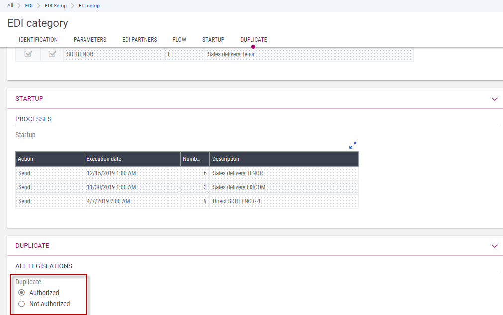 With the management of exceptions, you can restrict duplicate authorizations by legislation. For invoices, this management of exceptions is however subject to authorizations, which can be limited by legislation (See parameter EXDSALINV - Exceptions in sales invoice (TC chapter, EDI group)).