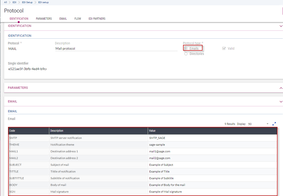 Two protocols are available to exchange sequential files. These protocols are used by partners of the same name: EDICOM and TENOR: