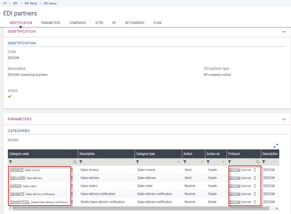 A category must be valid in order to be assigned to an EDI partner, itself linked to a flow. This information is displayed in the EDI partners and Flows sections.
