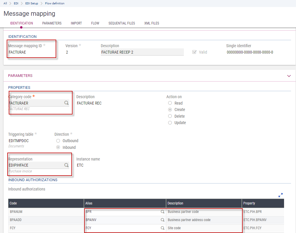 • Specify the aliases of the fields used as references when performing controls on the authorizations on inbound messages (for example, specify if a site control is applied to the sales site, the delivery site, the financial site, etc.).