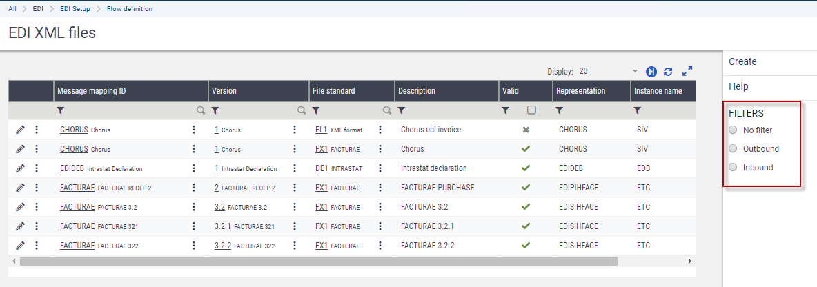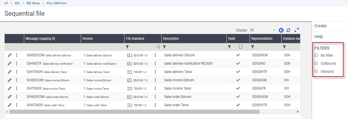 You can either display the formats for the outbound or inbound files using the predefined filters: Outbound and Inbound.