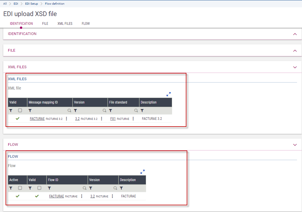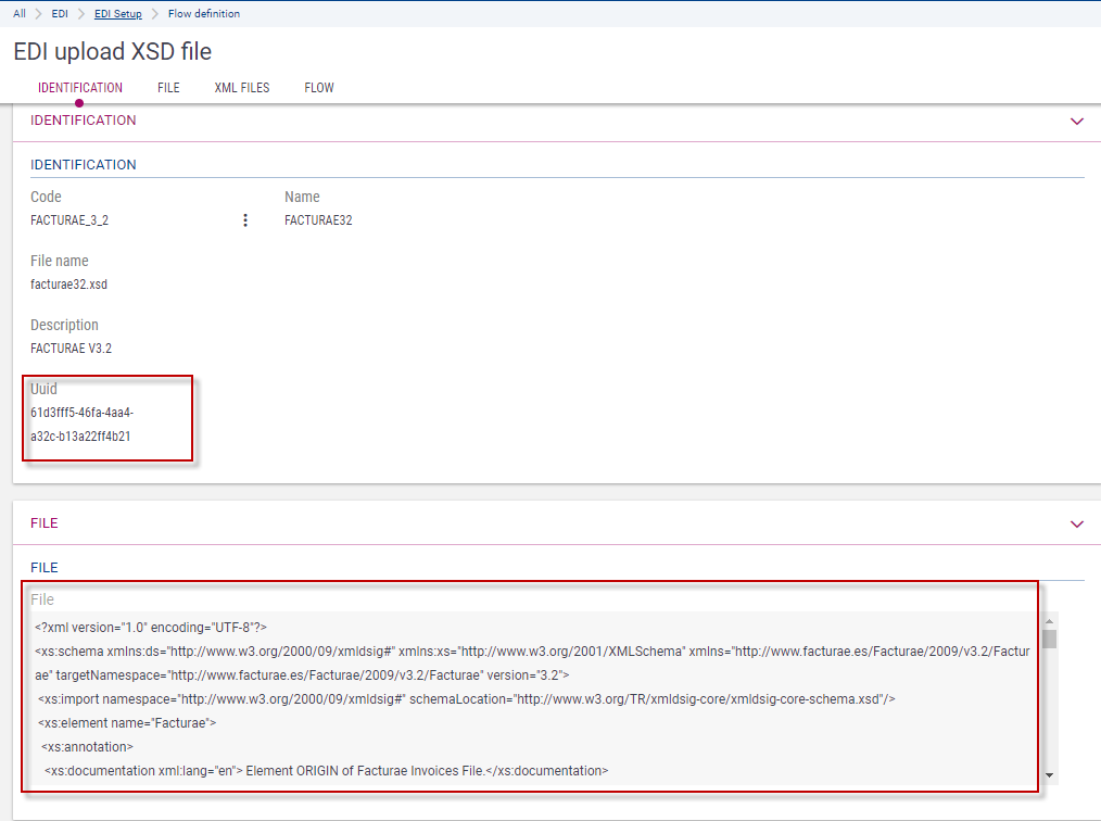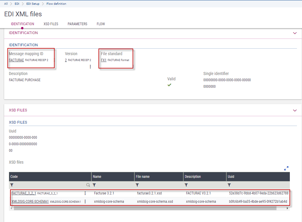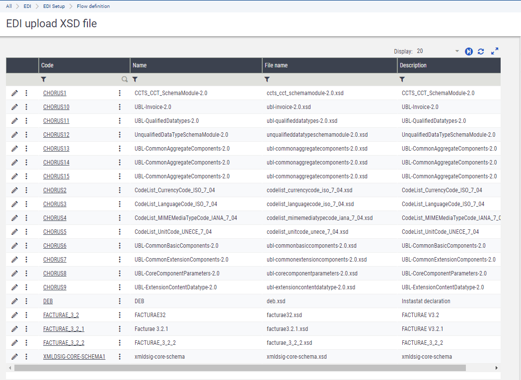 Use this screen to upload the files of the XSD schemas used to define and validate the formats of the exchanged XML files.