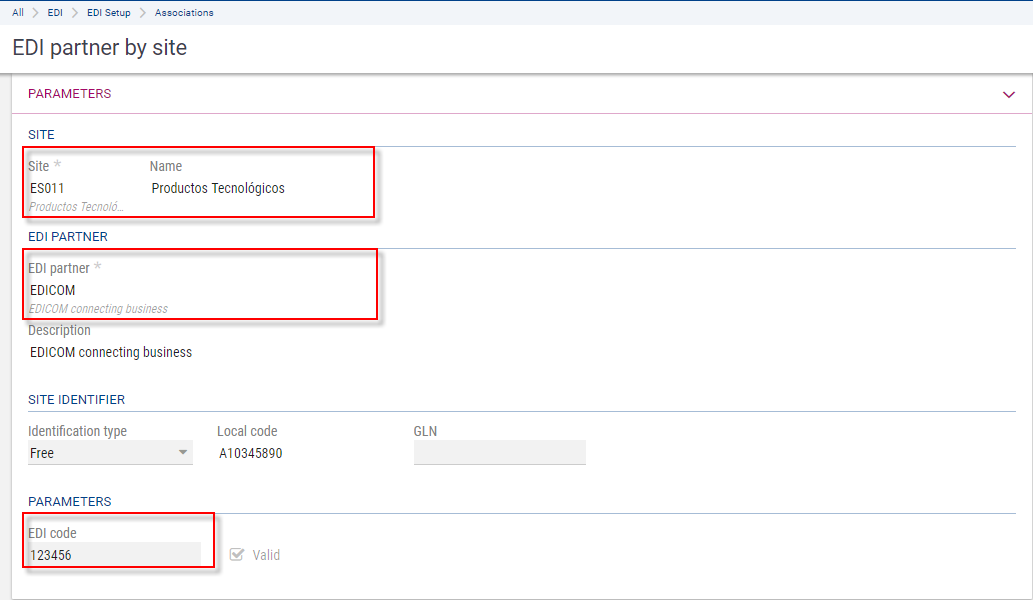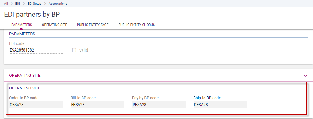 In addition, you can enter an EDI identification code provided by the partner. It is specific to each operating entity or site of this BP: