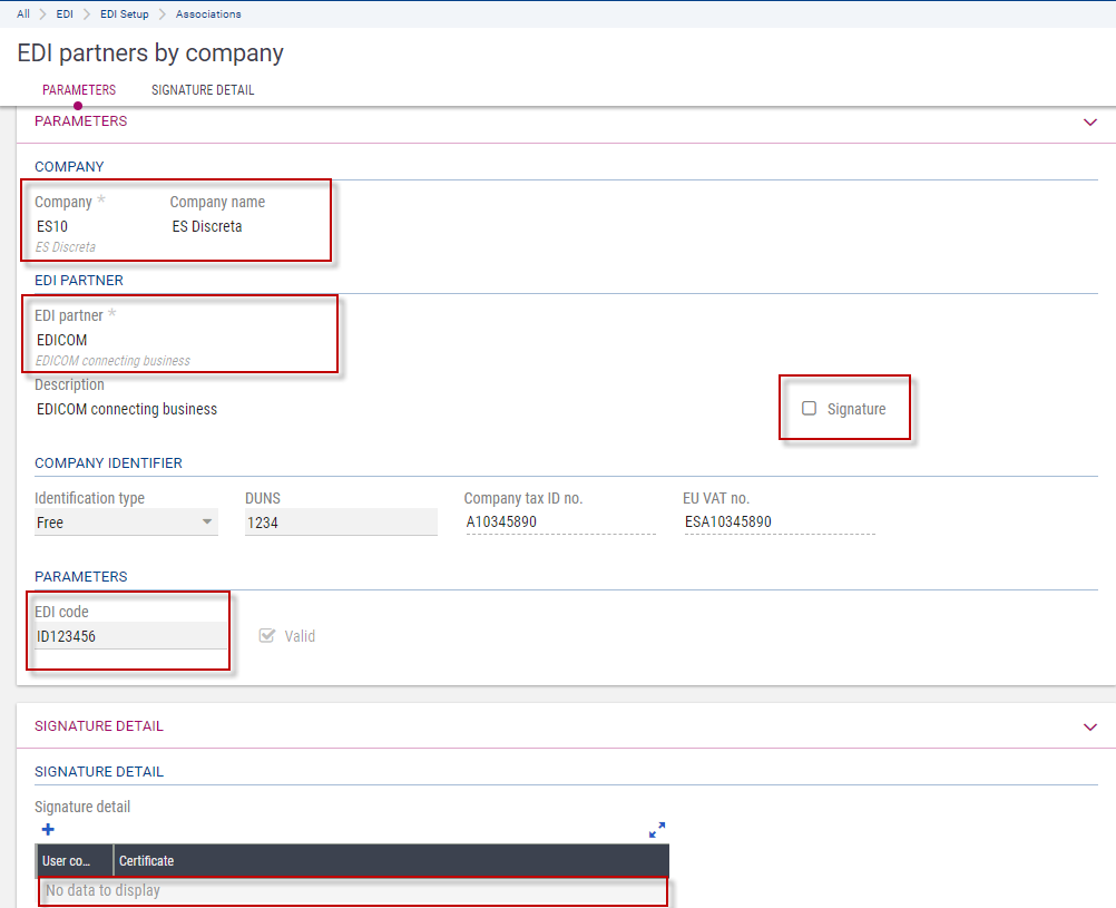 Specify the EDI code that identifies the company receiving/sending out documents. This code is considered as a priority over the identification code entered at the level of the EDI partners by company.