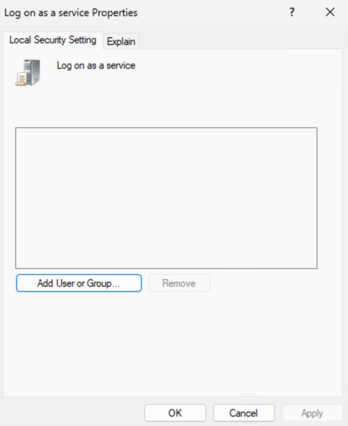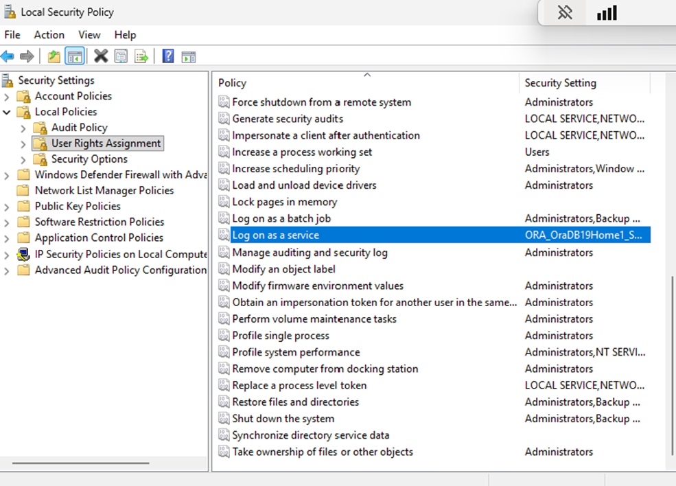 - Expand the Local Policies folder and select the User Rights Assignment folder. Right-click Log on as a service.