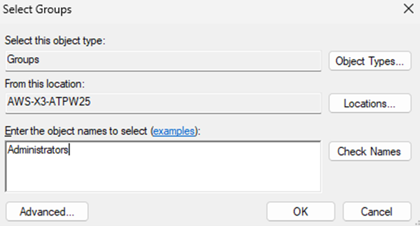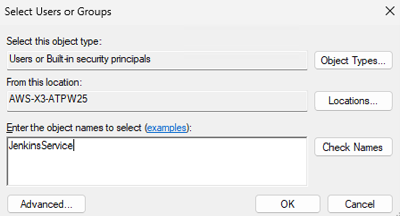 Enter the object names to select: Type in the JenkinsService administrator user.