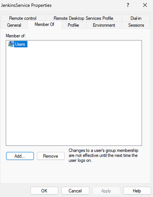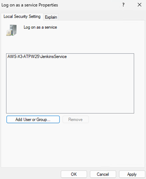 To enable the JenkinsService (administrator) user to log on as a service: