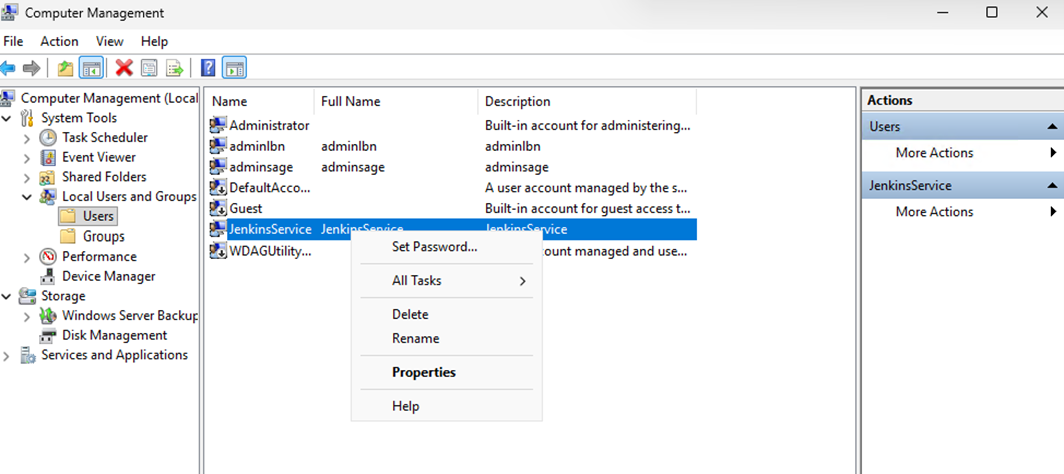 - Locate the Jenkins service. Right-click, then click Stop.