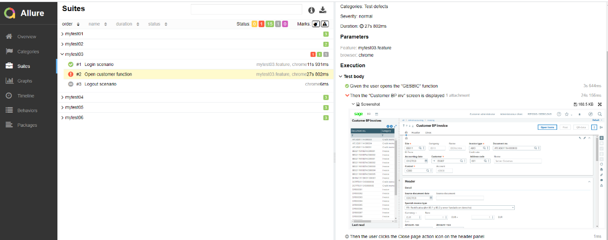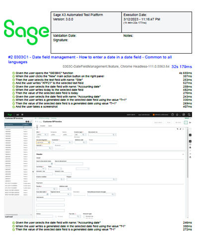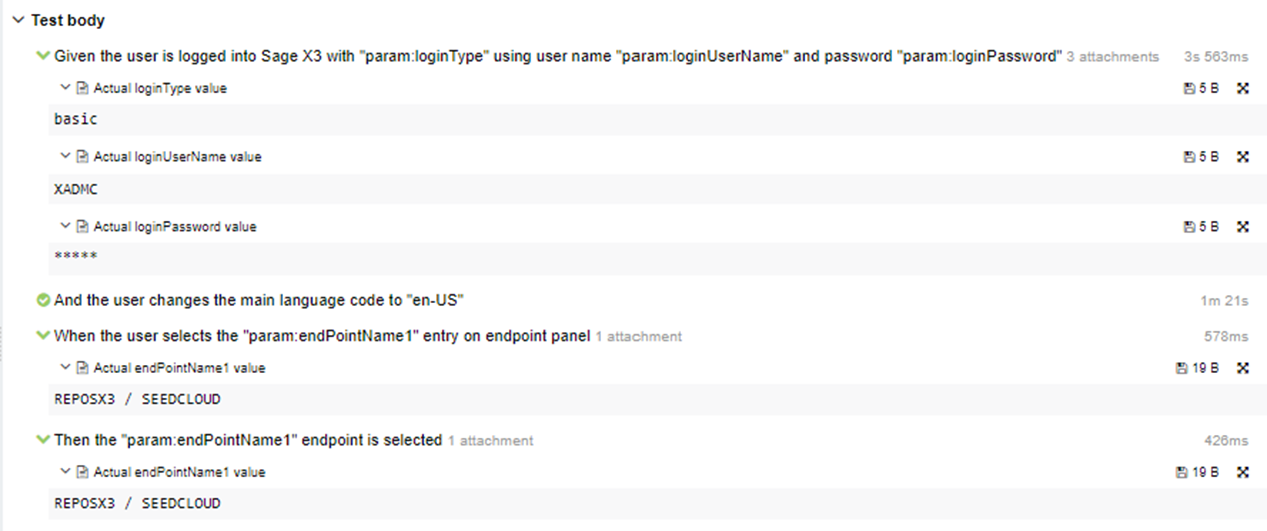 With Sage X3 Automation Test Platform version 3.3.0, allure report displays in attachment the code and the value of the (user) stored values calculated dynamically, as well as the value of the static parameters used during the test execution.