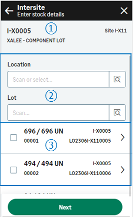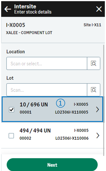 Note - informationIn this transaction, these filters do not display in the order in which you have defined them in the Mobile Automation setup function. They always display in the following order: Location, Lot, Sublot, Serial number (when the management mode is Received/Issued), Status, Packing unit, PAC/STK conversion factor, Identifier 1 and Identifier 2, Custom field 1 and Custom field 2.ExampleIn the Mobile Automation setup function, the Lot and the Location are the 2 filters defined for the I-X11 site.