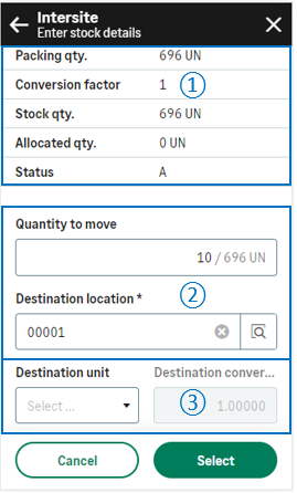 If the entry transaction is set only for the Intersite movement type and not for a Status or a Unit change, only the Destination location field displays. The Destination status and the Destination unit fields do not display.