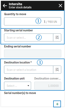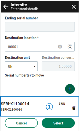 | Tap the + icon to validate your selection and display a summary of the serial numbers to move. |