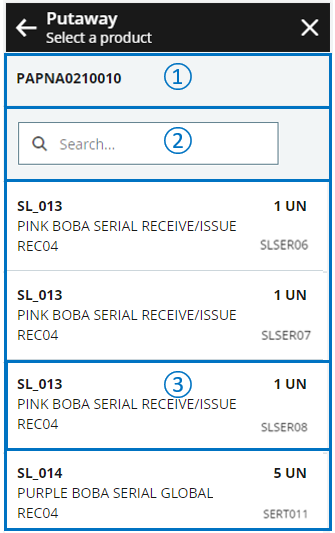 Use the Search field to filter the content of the list: Scan or type manually a product code, a location of origin, a serial number or a UPC code. | |