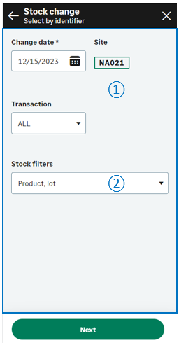 - In the initial page, check that the Change date, Site and Transaction default values are correct.
