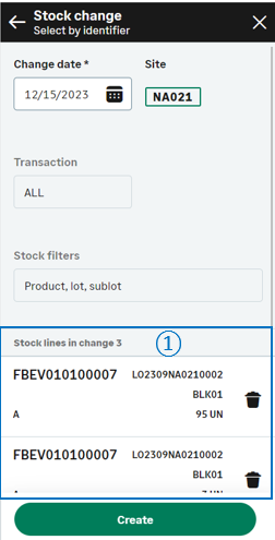 Tap Create when you are ready to validate the stock change creation and print the stock labels. Note - settingsTo print labels, refer to the functional prerequisites.