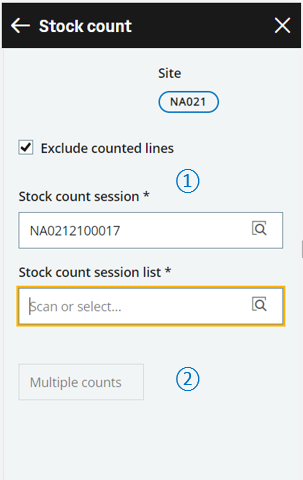 In the initial page, check that the Site default value is correct. Scan, select or enter the Stock count session and the Stock count session list. The Enter stock details page automatically displays the stock details of the first count line.