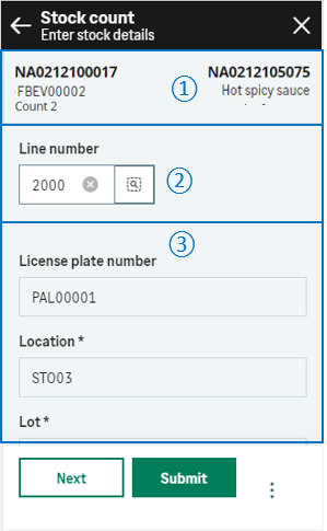 - Tap Add line from the More actions icon to create a new count line. The Enter stock details page automatically displays.
