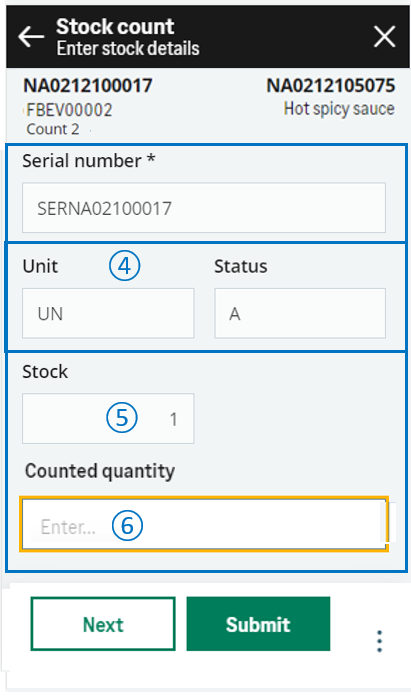 Tap Next to skip the line and display the Enter stock details page displaying the next stock count line.