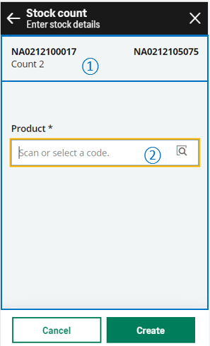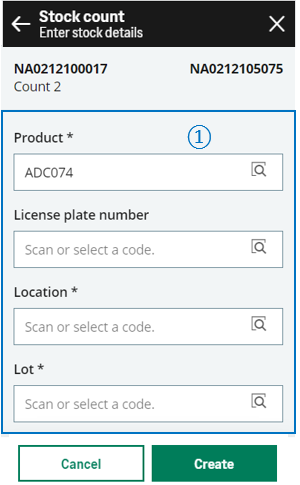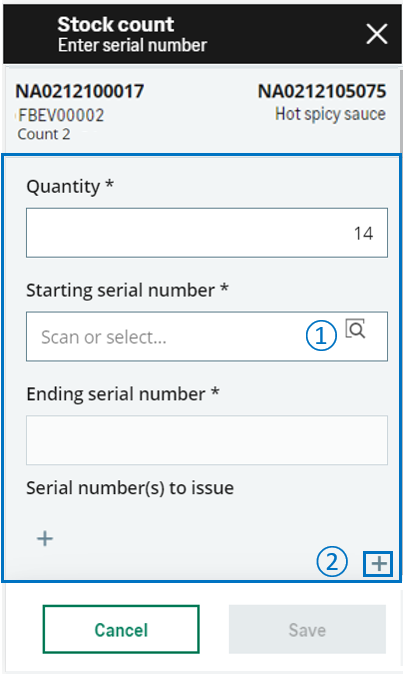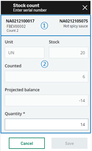 | Serial number | X | This field displays only if the serial number management mode of the product is Received/Issued. Scan or enter the serial number. If the product serial management mode is Received/Issued, the unit, the location and the status display automatically. Entry in this field is mandatory and the number of Counted products must be 0 or 1. |