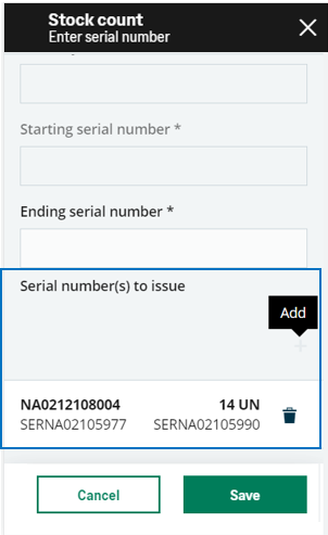 If a product is managed by global serial number, and the counted quantity is different from the stock quantity, you can select the range of serial numbers to receive or to issue.