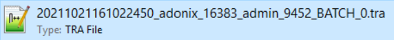 For example, a log file named 20220130102234450_adonix_16383_admin_34297_TESTLOGS_0.tra is the first log file for the TESTLOGS log settings for the admin user, and it was started on January 30, 2022, at 10:22:34 with process ID 34297.