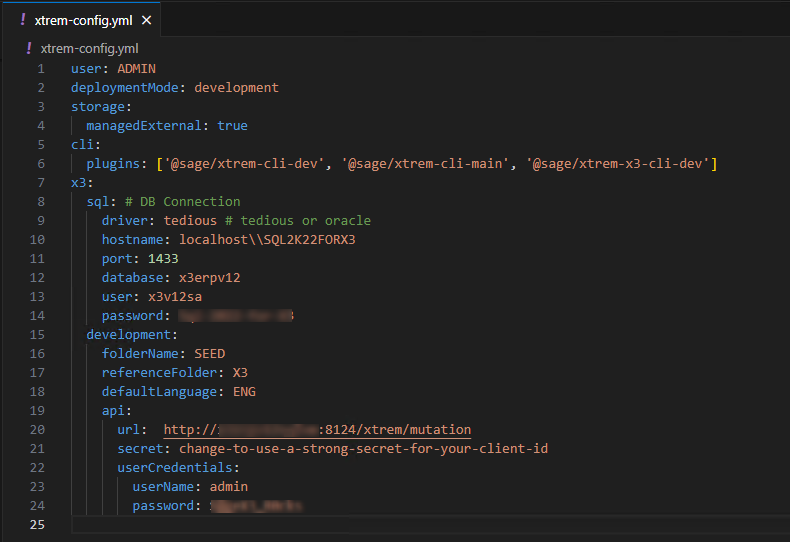- Open the xtrem-config.yml configuration file and enter the settings to connect to Sage X3.