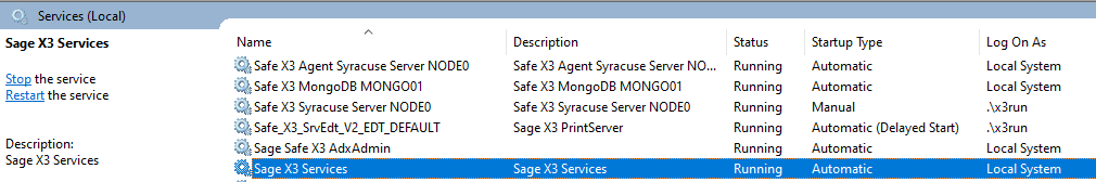 Sage does not recommend the use of the localsystem Windows administrative account to configure Sage X3 Services in Production environments. In Production environments, use a dedicated local account or a network account to configure Sage X3 Services.