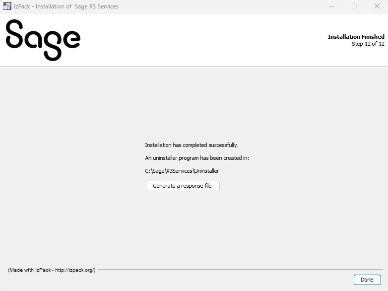 Click Done to conclude the installation procedure for Sage X3 Services.